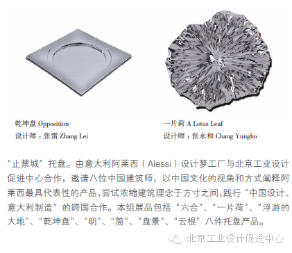 2010 年,北京工業(yè)設(shè)計(jì)促進(jìn)中心與意大利百年國(guó)際著名設(shè)計(jì)品牌阿萊西(Alessi)合作,由八位中國(guó)建筑設(shè)計(jì)師,以“止禁城”為主題,沖破“紫禁城” 思想文化的禁錮,以中國(guó)文化詮釋設(shè)計(jì),完成了八款創(chuàng)意“盤子”產(chǎn)品,并在阿萊西全球五千多個(gè)商店銷售?!昂?jiǎn)”是紙張發(fā)明以前中國(guó)人的書寫材料,由同樣的牘片串聯(lián)而成。在“簡(jiǎn)”被金屬設(shè)計(jì)制成用來呈送碗盞的“盤子”時(shí),也在呈送中國(guó)人古老智慧。“荷” 0 1 4 設(shè)計(jì)的大地 The Va s t Land of D e s i g n