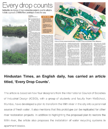針對(duì)中國(guó)設(shè)計(jì)師完成的設(shè)計(jì)項(xiàng)目,《印度斯坦時(shí)報(bào)》刊登的題為“滴水不漏”的文章,對(duì)米斯河改造計(jì)劃進(jìn)行了解讀,文中說(shuō):“北京工業(yè)設(shè)計(jì)促進(jìn)中心的設(shè)計(jì)師馮春慧、蔣偉、黃睿等,與孟買當(dāng)?shù)豔eschool學(xué)院的教授及學(xué)生設(shè)計(jì)制定的米斯河改造模式以及公寓樓循環(huán)用水系統(tǒng),為米斯河沿岸居民干凈飲用水缺乏的問(wèn)題提供了解決途徑,實(shí)施后將促使斯河成為一個(gè)常年的淡水源。該改造模式亦可應(yīng)用于其他的河流修復(fù)項(xiàng)目。”