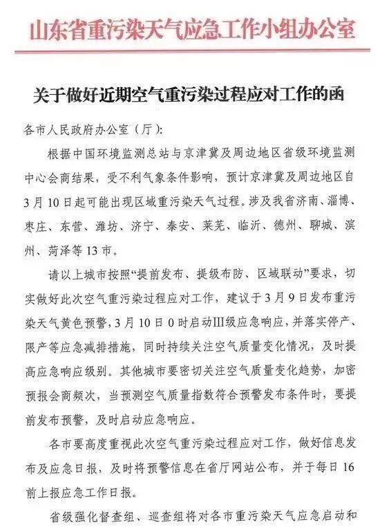 要求各市在3月10日0時(shí)至3月14日24時(shí)期間,采取不低于橙色級(jí)別的應(yīng)急減排措施,并隨時(shí)根據(jù)空氣質(zhì)量變化情況提高預(yù)警級(jí)別。