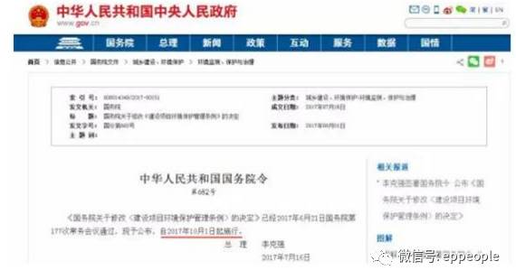 2017年10月1日起,國務(wù)院第682號(hào)令公布的《國務(wù)院關(guān)于修改〈建設(shè)項(xiàng)目環(huán)境保護(hù)管理?xiàng)l例〉的決定》相比老的《建設(shè)項(xiàng)目環(huán)境保護(hù)管理?xiàng)l例》有重大調(diào)整: