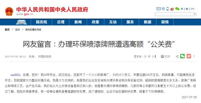 wu0802:總理,您好!我08年畢業(yè),經(jīng)過創(chuàng)業(yè),目前開了一個小小的家具廠,大約15個員工,年營業(yè)額200萬左右,利潤單薄,只能維持生活開支。目前國家大力整治環(huán)境污染,我是大力支持的,但是我們企業(yè)在咨詢和辦理環(huán)保證和環(huán)保設備這塊,碰到的困難疑惑太多太多。家具廠有粉塵和噴漆工藝,會產(chǎn)生污染,我們也認為上環(huán)保設備是利已利人的,但是要辦理環(huán)保噴漆牌照,幾家環(huán)保公司都開口索要五十萬以上的公關費。經(jīng)過了解,現(xiàn)在環(huán)保查得緊,有一些單位借機索要高額的好處費,成了潛規(guī)則,企業(yè)不給巨額的好處費,就拿不下環(huán)保牌照。