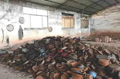 河北高邑一家小鑄造廠(chǎng)的半成品鍋堆放點(diǎn),一片雜亂。