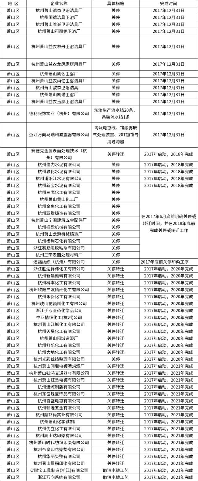 蕭山區(qū)要實(shí)施關(guān)停轉(zhuǎn)遷和兼并重組等措施,2017年啟動(dòng)、2021年左右核減印染企業(yè)數(shù)量至19家;2017年啟動(dòng)、2020年前全面完成蕭山區(qū)空港經(jīng)濟(jì)區(qū)、紅山農(nóng)場(chǎng)等區(qū)域化工行業(yè)結(jié)構(gòu)調(diào)整工作,逐步取消化學(xué)合成工藝;2017年啟動(dòng)、2018年年底前完成蕭山境內(nèi)4家水泥粉磨站關(guān)停工作;2017年啟動(dòng)、2021年年底前完成繞城高速公路以?xún)?nèi)鑄造、電鍍企業(yè)(車(chē)間)關(guān)停轉(zhuǎn)遷工作。