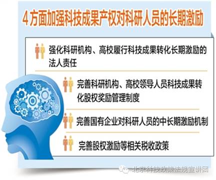 (一)強(qiáng)化科研機(jī)構(gòu)、高校履行科技成果轉(zhuǎn)化長期激勵的法人責(zé)任。堅持長期產(chǎn)權(quán)激勵與現(xiàn)金獎勵并舉,探索對科研人員實施股權(quán)、期權(quán)和分紅激勵,加大在專利權(quán)、著作權(quán)、植物新品種權(quán)、集成電路布圖設(shè)計專有權(quán)等知識產(chǎn)權(quán)及科技成果轉(zhuǎn)化形成的股權(quán)、崗位分紅權(quán)等方面的激勵力度??蒲袡C(jī)構(gòu)、高校應(yīng)建立健全科技成果轉(zhuǎn)化內(nèi)部管理與獎勵制度,自主決定科技成果轉(zhuǎn)化收益分配和獎勵方案,單位負(fù)責(zé)人和相關(guān)責(zé)任人按照《中華人民共和國促進(jìn)科技成果轉(zhuǎn)化法》及《實施〈中華人民共和國促進(jìn)科技成果轉(zhuǎn)化法〉若干規(guī)定》予以免責(zé),構(gòu)建對科技人員的股權(quán)激勵等中長期激勵機(jī)制。以科技成果作價入股作為對科技人員的獎勵涉及股權(quán)注冊登記及變更的,無需報科研機(jī)構(gòu)、高校的主管部門審批。加快出臺科研機(jī)構(gòu)、高校以科技成果作價入股方式投資未上市中小企業(yè)形成的國有股,在企業(yè)上市時豁免向全國社會保障基金轉(zhuǎn)持的政策。