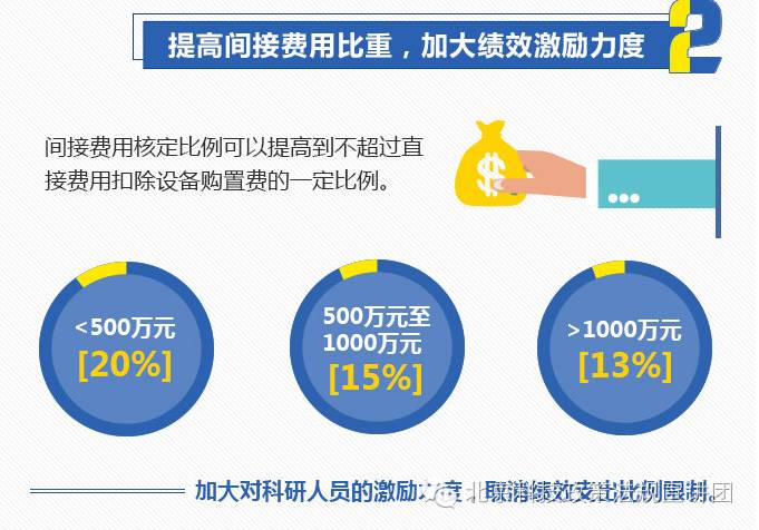 (二)提高間接費用比重,加大績效激勵力度。中央財政科技計劃(專項、基金等)中實行公開競爭方式的研發(fā)類項目,均要設立間接費用,核定比例可以提高到不超過直接費用扣除設備購置費的一定比例:500萬元以下的部分為20%,500萬元至1000萬元的部分為15%,1000萬元以上的部分為13%。加大對科研人員的激勵力度,取消績效支出比例限制。項目承擔單位在統(tǒng)籌安排間接費用時,要處理好合理分攤間接成本和對科研人員激勵的關系,績效支出安排與科研人員在項目工作中的實際貢獻掛鉤。