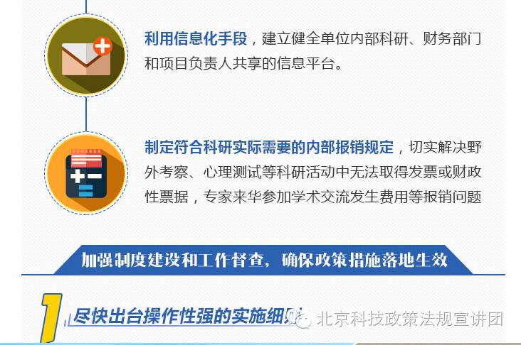 (三)創(chuàng)新服務方式,讓科研人員潛心從事科學研究。項目承擔單位要建立健全科研財務助理制度,為科研人員在項目預算編制和調劑、經費支出、財務決算和驗收等方面提供專業(yè)化服務,科研財務助理所需費用可由項目承擔單位根據情況通過科研項目資金等渠道解決。充分利用信息化手段,建立健全單位內部科研、財務部門和項目負責人共享的信息平臺,提高科研管理效率和便利化程度。制定符合科研實際需要的內部報銷規(guī)定,切實解決野外考察、心理測試等科研活動中無法取得發(fā)票或財政性票據,以及邀請外國專家來華參加學術交流發(fā)生費用等的報銷問題。