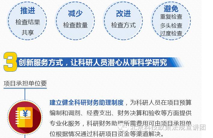 (二)加強統(tǒng)籌協(xié)調,精簡檢查評審??萍疾俊㈨椖恐鞴懿块T、財政部要加強對科研項目資金監(jiān)督的制度規(guī)范、年度計劃、結果運用等的統(tǒng)籌協(xié)調,建立職責明確、分工負責的協(xié)同工作機制??萍疾?、項目主管部門要加快清理規(guī)范委托中介機構對科研項目開展的各種檢查評審,加強對前期已經開展相關檢查結果的使用,推進檢查結果共享,減少檢查數量,改進檢查方式,避免重復檢查、多頭檢查、過度檢查。