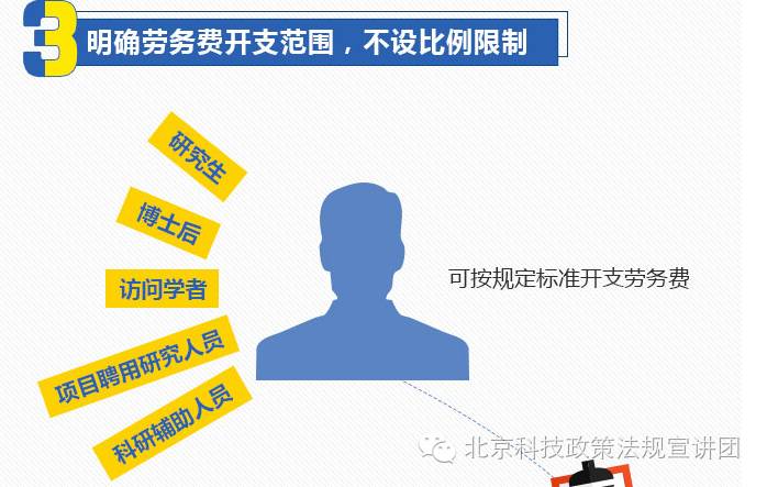 (三)明確勞務費開支范圍,不設比例限制。參與項目研究的研究生、博士后、訪問學者以及項目聘用的研究人員、科研輔助人員等,均可開支勞務費。項目聘用人員的勞務費開支標準,參照當地科學研究和技術服務業(yè)從業(yè)人員平均工資水平,根據其在項目研究中承擔的工作任務確定,其社會保險補助納入勞務費科目列支。勞務費預算不設比例限制,由項目承擔單位和科研人員據實編制。