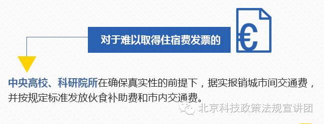 (一)改進中央高校、科研院所教學科研人員差旅費管理。中央高校、科研院所可根據教學、科研、管理工作實際需要,按照精簡高效、厲行節(jié)約的原則,研究制定差旅費管理辦法,合理確定教學科研人員乘坐交通工具等級和住宿費標準。對于難以取得住宿費發(fā)票的,中央高校、科研院所在確保真實性的前提下,據實報銷城市間交通費,并按規(guī)定標準發(fā)放伙食補助費和市內交通費。