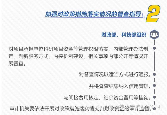 (二)加強對政策措施落實情況的督查指導。財政部、科技部要適時組織開展對項目承擔單位科研項目資金等管理權限落實、內部管理辦法制定、創(chuàng)新服務方式、內控機制建設、相關事項內部公開等情況的督查,對督查情況以適當方式進行通報,并將督查結果納入信用管理,與間接費用核定、結余資金留用等掛鉤。審計機關要依法開展對政策措施落實情況和財政資金的審計監(jiān)督。項目主管部門要督促指導所屬單位完善內部管理,確保國家政策規(guī)定落到實處。