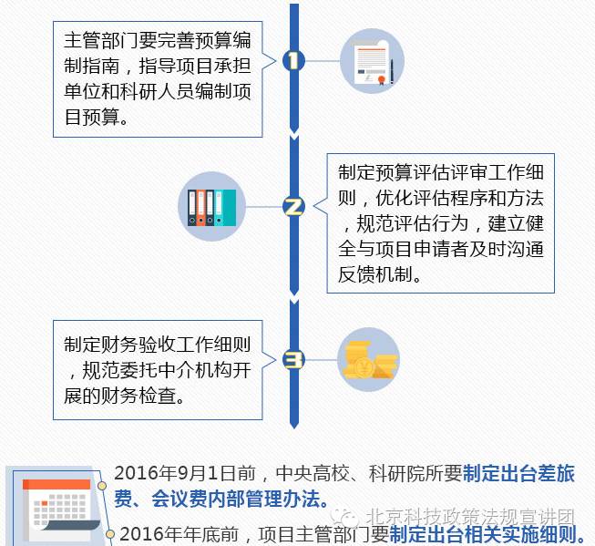 (一)盡快出臺操作性強的實施細則。項目主管部門要完善預算編制指南,指導項目承擔單位和科研人員科學合理編制項目預算;制定預算評估評審工作細則,優(yōu)化評估程序和方法,規(guī)范評估行為,建立健全與項目申請者及時溝通反饋機制;制定財務驗收工作細則,規(guī)范委托中介機構開展的財務檢查。2016年9月1日前,中央高校、科研院所要制定出臺差旅費、會議費內部管理辦法,其主管部門要加強工作指導和統(tǒng)籌;2016年年底前,項目主管部門要制定出臺相關實施細則,項目承擔單位要制定或修訂科研項目資金內部管理辦法和報銷規(guī)定。以后年度承擔科研項目的單位要于當年制定出臺相關管理辦法和規(guī)定。