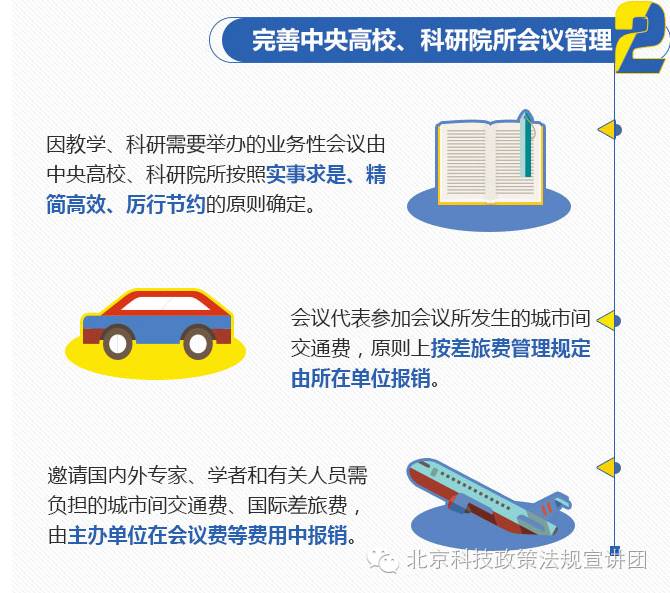 (二)完善中央高校、科研院所會議管理。中央高校、科研院所因教學、科研需要舉辦的業(yè)務性會議(如學術會議、研討會、評審會、座談會、答辯會等),會議次數、天數、人數以及會議費開支范圍、標準等,由中央高校、科研院所按照實事求是、精簡高效、厲行節(jié)約的原則確定。會議代表參加會議所發(fā)生的城市間交通費,原則上按差旅費管理規(guī)定由所在單位報銷;因工作需要,邀請國內外專家、學者和有關人員參加會議,對確需負擔的城市間交通費、國際旅費,可由主辦單位在會議費等費用中報銷。