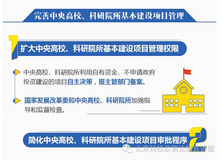 (一)擴大中央高校、科研院所基本建設項目管理權限。對中央高校、科研院所利用自有資金、不申請政府投資建設的項目,由中央高校、科研院所自主決策,報主管部門備案,不再進行審批。國家發(fā)展改革委和中央高校、科研院所主管部門要加強對中央高校、科研院所基本建設項目的指導和監(jiān)督檢查。