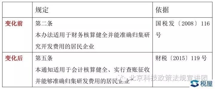 新政增加了“實行查賬征收”的規(guī)定,更大的意義在于修補完善原有政策,事實上,“核定征收”的企業(yè),在原有規(guī)定下,也難以符合“財務(wù)核算健全并能準(zhǔn)確歸集研究開發(fā)費用”的規(guī)定,無法享受研發(fā)費用加計扣除政策。