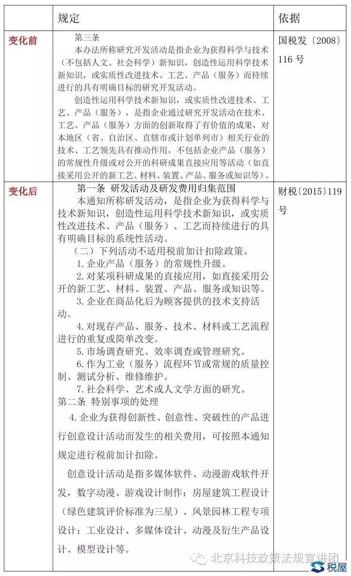 (二)對“研發(fā)活動內(nèi)涵、外延”的界定,從“正列舉”改為“反列舉”,由此帶來兩個效果:一是大大擴大了研發(fā)活動的范圍;二是對實際管理帶來了明確的執(zhí)行標(biāo)準(zhǔn)。