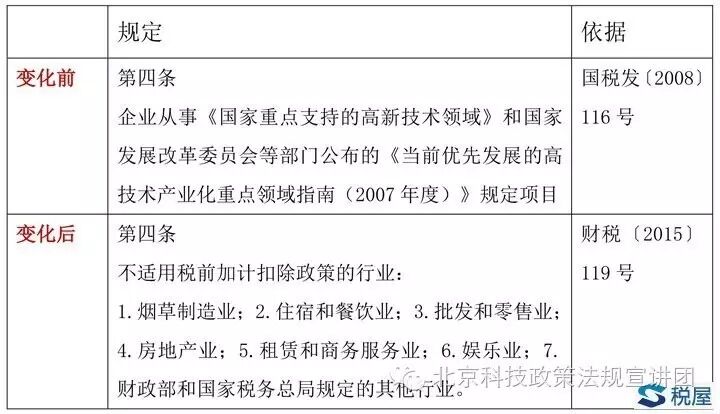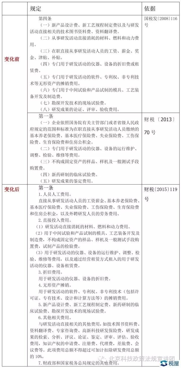 2015年11月2日,財政部、國家稅務(wù)總局、科技部聯(lián)合發(fā)布《關(guān)于完善研究開發(fā)費用稅前加計扣除政策的通知》(財稅〔2015〕119號),具體細化、落實近日國務(wù)院有關(guān)研發(fā)費用加計扣除政策調(diào)整的決定,同時廢止《國家稅務(wù)總局關(guān)于印發(fā)〈企業(yè)研究開發(fā)費用稅前扣除管理辦法(試行)〉的通知》(國稅發(fā)〔2008〕116號)和《財政部 國家稅務(wù)總局關(guān)于研究開發(fā)費用稅前加計扣除有關(guān)政策問題的通知》(財稅〔2013〕70號),新政將自2016年1月1日起執(zhí)行。本期我們將通過對比財稅〔2015〕119號與國稅發(fā)〔2008〕116號、財稅〔2013〕70號,全面剖析新政在研發(fā)費用加計扣除方面的變化,以幫助企業(yè)在進行新政要求下順利進行加計扣除工作。