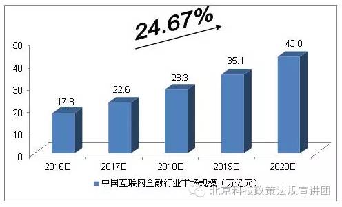 近年來,互聯(lián)網(wǎng)金融在信息技術(shù)和市場需求的驅(qū)動下異軍突起,發(fā)展迅猛,用戶人數(shù)、市場規(guī)模等多項指標(biāo)均處于世界領(lǐng)先地位。據(jù)預(yù)計,2016年中國互聯(lián)網(wǎng)金融行業(yè)市場規(guī)模將達17.8萬億元,2020年預(yù)計將達43.0萬億元。未來五年(2016-2020)行業(yè)年均復(fù)合增長率約為24.67%。