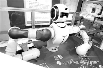 圖為科博會上安川首鋼機器人有限公司展示他們最新研制的新型雙臂機器人玩牌系統(tǒng)。