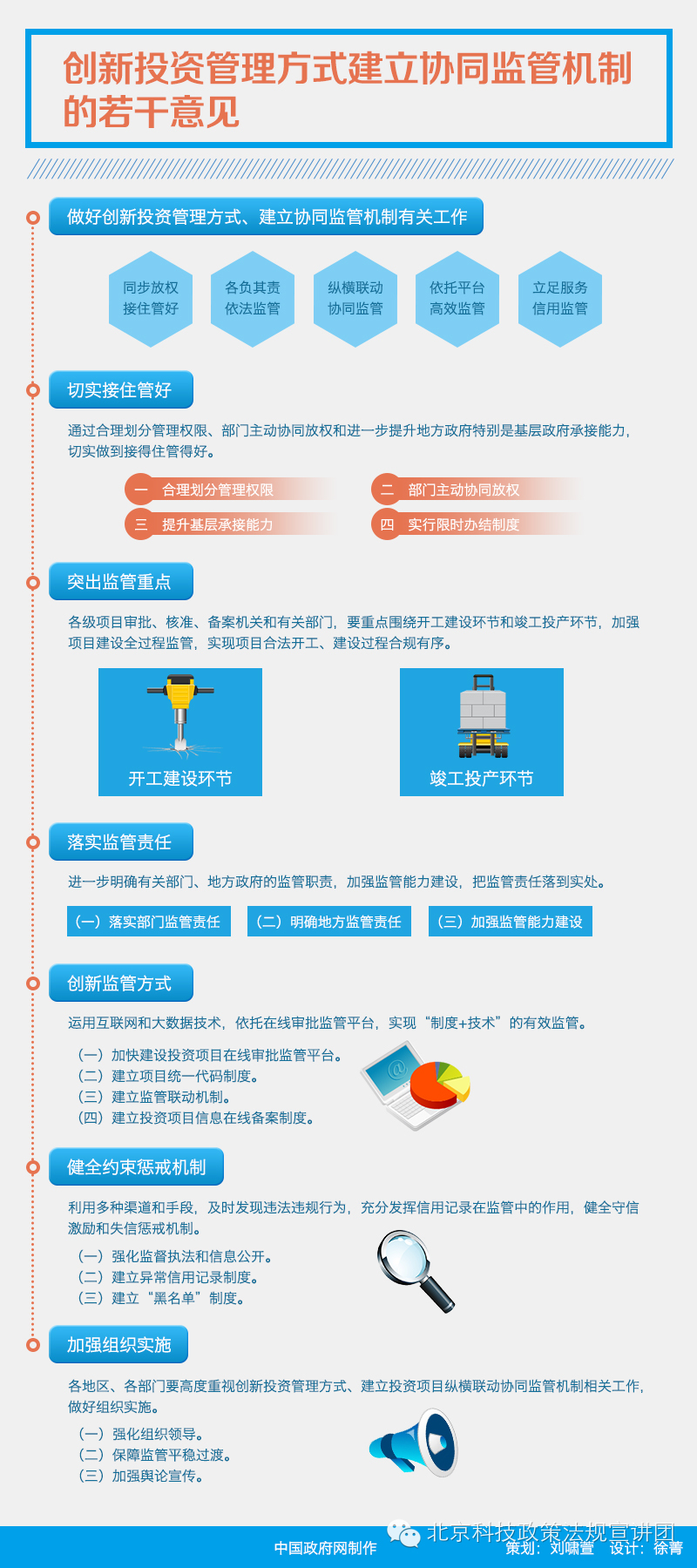 《意見(jiàn)》從創(chuàng)新管理入手,圍繞既放權(quán)到位、接住管好,又服務(wù)到位、監(jiān)管有效,促進(jìn)市場(chǎng)秩序更加規(guī)范,市場(chǎng)活力充分釋放的改革目標(biāo),明確了建立縱橫聯(lián)動(dòng)協(xié)同監(jiān)管機(jī)制的總體要求和基本原則,提出了通過(guò)建設(shè)信息共享、覆蓋全國(guó)的投資項(xiàng)目在線審批監(jiān)管平臺(tái),實(shí)現(xiàn)“制度+技術(shù)”有效監(jiān)管的主要政策措施。
