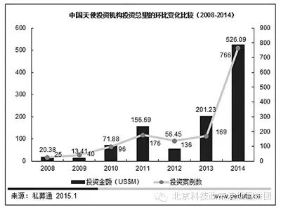 | 中國天使投資機(jī)構(gòu)投資總量的環(huán)比變化比較(2008—2014) 數(shù)據(jù)來源:清科集團(tuán) |
