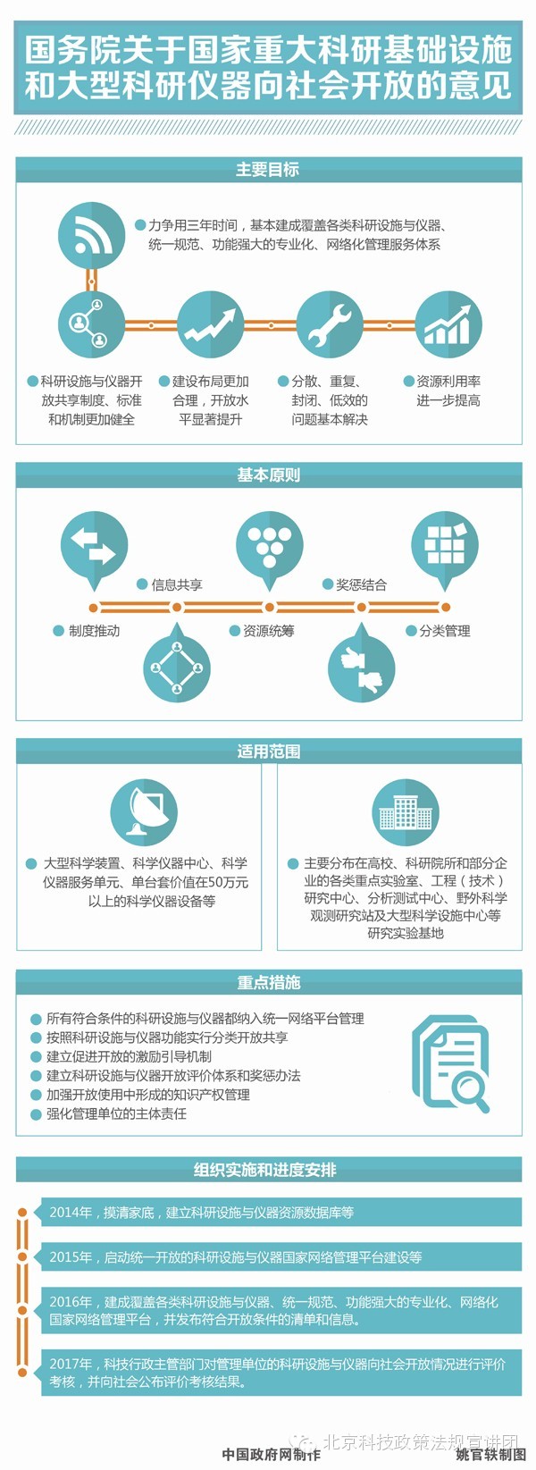 《意見》明確了改革的組織實施和進度安排,提出到2015年啟動統(tǒng)一開放的科研設(shè)施與儀器國家網(wǎng)絡(luò)管理平臺建設(shè);到2016年,所有符合條件的科研設(shè)施與儀器納入國家網(wǎng)絡(luò)管理平臺管理;到2017年,對管理單位的科研設(shè)施與儀器向社會開放情況進行評價考核,并向社會公布評價考核結(jié)果。