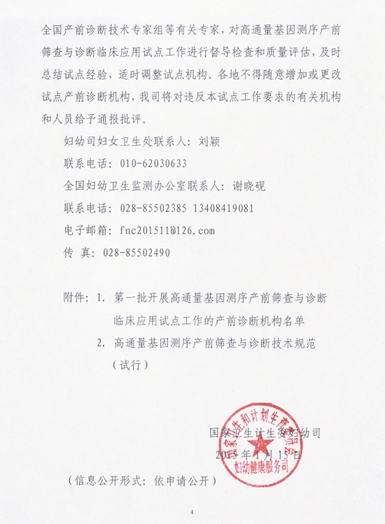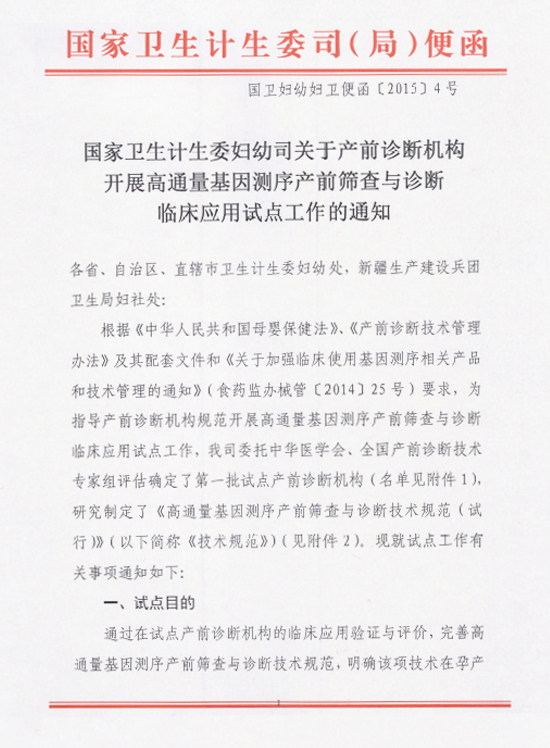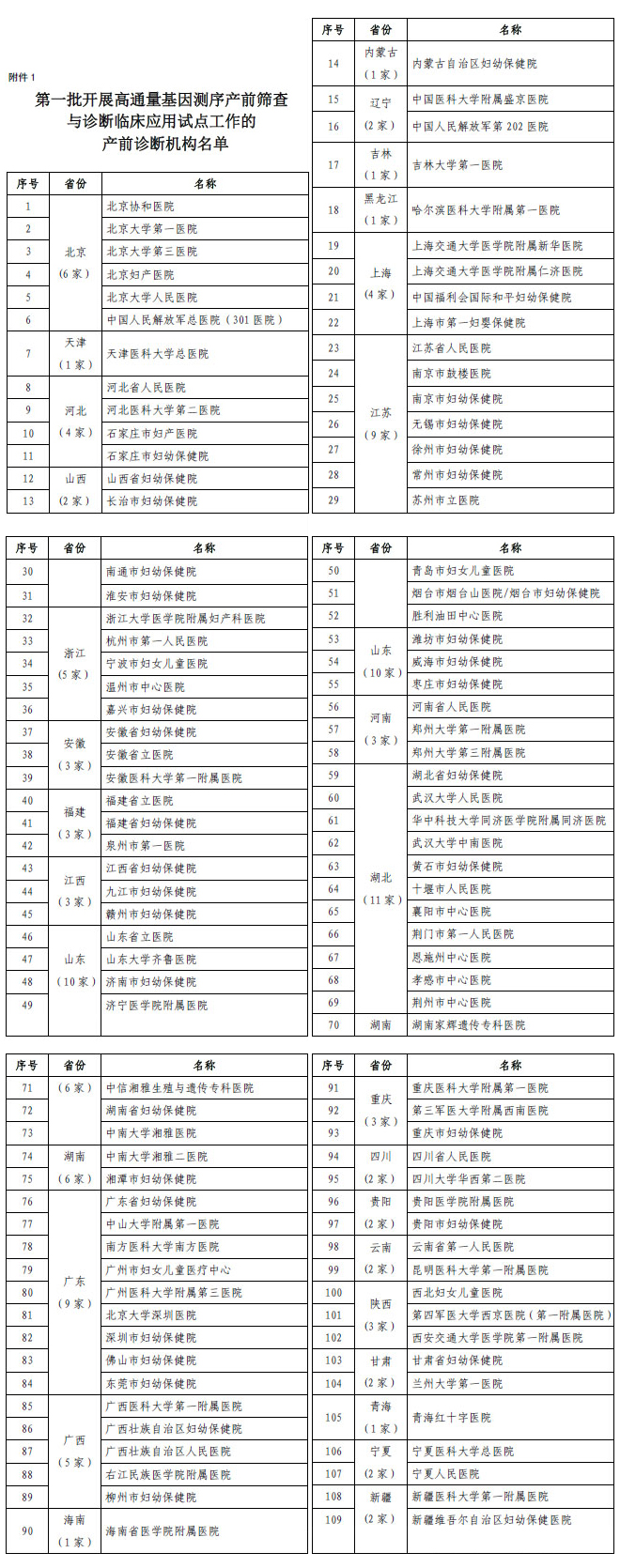 繼衛(wèi)計(jì)委醫(yī)政司發(fā)布第一批基因測序臨床試點(diǎn)后,2015年1月15日,衛(wèi)計(jì)委婦幼司發(fā)布了第一批可以開展NIPT的產(chǎn)前診斷試點(diǎn)單位,全國31個(gè)省市地區(qū)共有109家機(jī)構(gòu)入選,通知截圖及入選單位和名單如下所示: