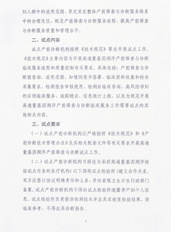 在婦幼司此次發(fā)布的通知中,即提到試點(diǎn)內(nèi)容是:產(chǎn)前篩查與診斷前咨詢,適用范圍,知情同意書簽署,臨床資料收集和標(biāo)本采集要求,檢測報(bào)告審核使用,檢測后臨床咨詢,高風(fēng)險(xiǎn)孕婦的后續(xù)臨床服務(wù),追蹤隨訪,信息統(tǒng)計(jì)上報(bào),以及為規(guī)范開展高通量基因測序產(chǎn)前篩查與診斷臨床服務(wù)工作需要試點(diǎn)的其他相關(guān)內(nèi)容。