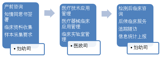 如果將基因測序產(chǎn)前診斷看做一條鏈,那么婦幼司主要負(fù)責(zé)前端和后端管理,醫(yī)政司主要負(fù)責(zé)中間管理,三者合并起來,即形成醫(yī)療機(jī)構(gòu)提供高通量測序服務(wù)的整個(gè)體系,如下圖所示: