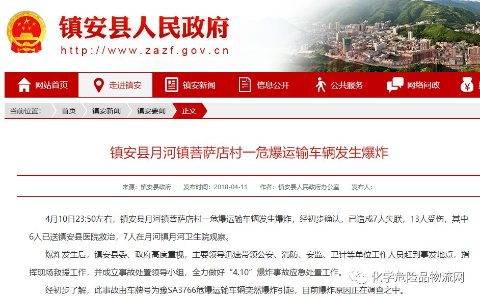 據(jù)鎮(zhèn)安縣人民政府網(wǎng)站11日上午通報(bào),4月10日23:50左右,鎮(zhèn)安縣月河鎮(zhèn)菩薩店村一危爆運(yùn)輸車輛發(fā)生爆炸,經(jīng)初步確認(rèn),已造成7人失聯(lián),13人受傷,其中6人已送鎮(zhèn)安縣醫(yī)院救治,7人在月河鎮(zhèn)月河衛(wèi)生院觀察。