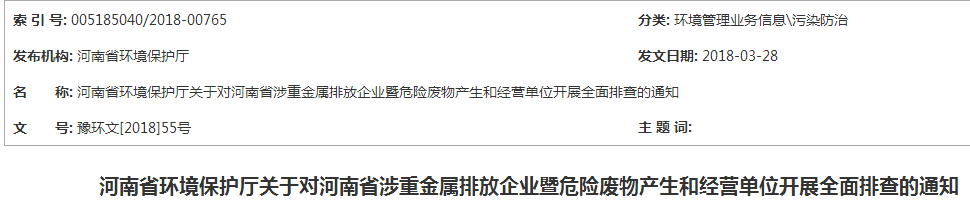 河南:3月28日至5月15日對(duì)涉重金屬排放企業(yè)暨危廢企業(yè)進(jìn)行全面排查