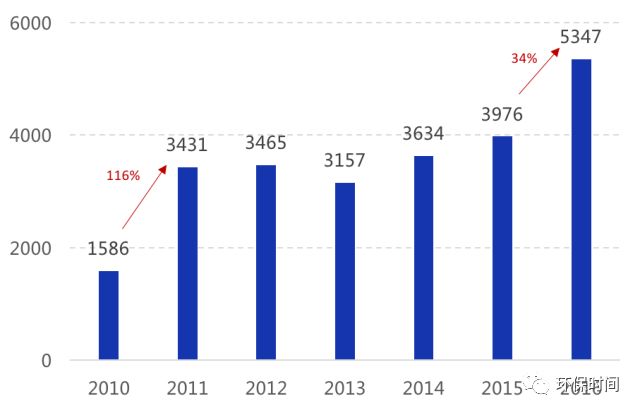 2)這種統(tǒng)計量的增長在2011年時也曾發(fā)生,2011年危廢產(chǎn)量在1kg以上的均納入統(tǒng)計,所以當年由2010年之前產(chǎn)生量1500萬噸左右飛躍到3400多萬噸。