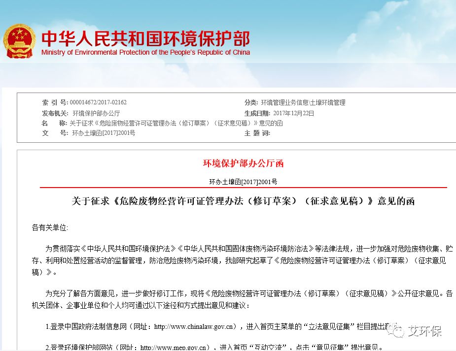 2017年12月22日環(huán)境保護部辦公廳提出“關(guān)于征求《危險廢物經(jīng)營許可證管理辦法(修訂草案)(征求意見稿)》意見的函(環(huán)辦土壤函[2017]2001號),征求意見截止時間為2018年1月25日。此次關(guān)于“第三十九條 以下危險廢物利用或者處置活動免于領(lǐng)取危險廢物經(jīng)營許可證”的五條內(nèi)容進行舉例說明,希望對企業(yè)在危廢處置上有所啟發(fā):
