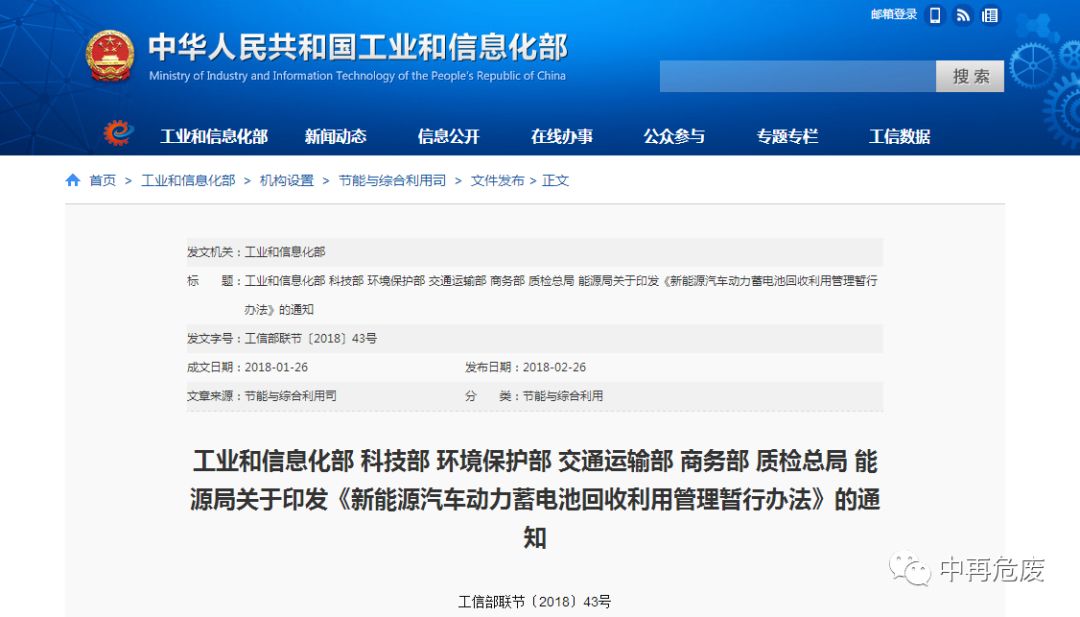 第四條 工業(yè)和信息化部會(huì)同科技部、環(huán)境保護(hù)部、交通運(yùn)輸部、商務(wù)部、質(zhì)檢總局、能源局在各自職責(zé)范圍內(nèi)對(duì)動(dòng)力蓄電池回收利用進(jìn)行管理和監(jiān)督。