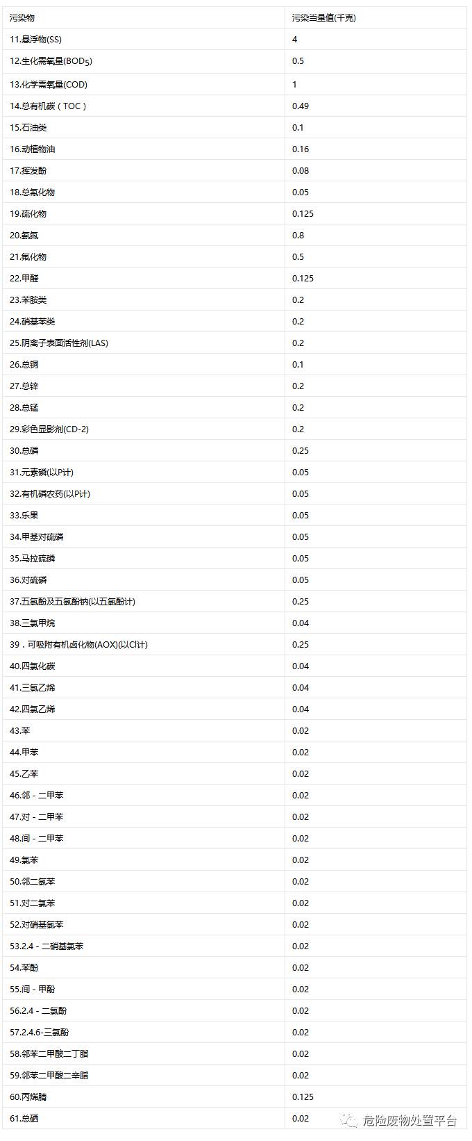 污染當量:按照不同的污染物種類按天或月進行測算計費值。污染當量是收集企業(yè)排污稅費的參考數(shù)據(jù)。某污染物的污染當量數(shù)=該污染物的排放量(千克)/該污染物的污染當量值(千克)。