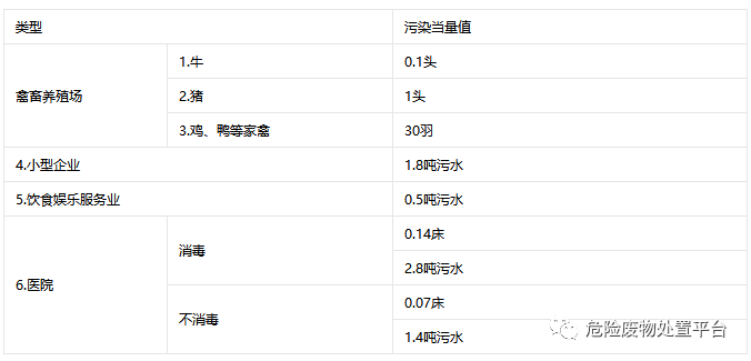 注:1.本表僅適用于計算無法進行實際監(jiān)測或物料衡算的禽畜養(yǎng)殖業(yè)、小型企業(yè)和第三產(chǎn)業(yè)等小型排污者的污染當量數(shù)。