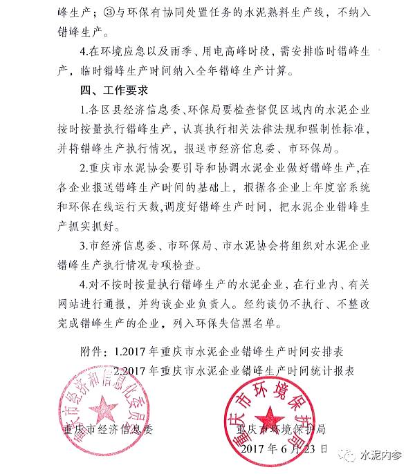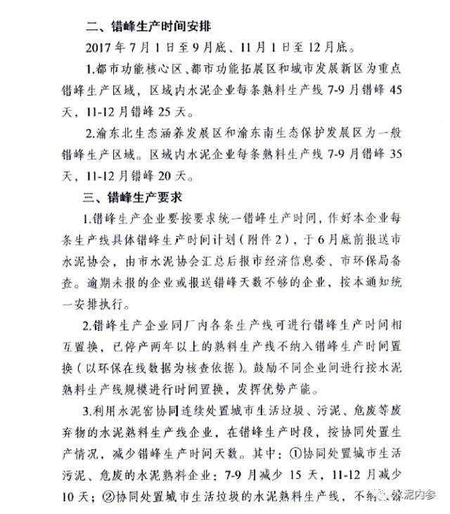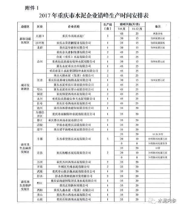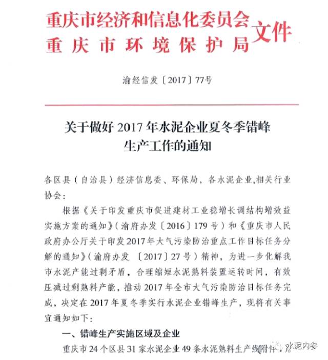 重慶市經(jīng)濟(jì)和信息化委員會(huì)和重慶市環(huán)境保護(hù)局聯(lián)合發(fā)布了《關(guān)于做好2017年水泥企業(yè)夏冬季錯(cuò)峰生產(chǎn)工作的通知》(以下簡(jiǎn)稱“通知”)。通知明確,為進(jìn)一步化解重慶市水泥產(chǎn)能過(guò)剩矛盾,合理縮短水泥熟料裝置運(yùn)轉(zhuǎn)時(shí)間,有效壓減過(guò)剩熟料產(chǎn)能,推動(dòng)2017年全市大氣污染防治目標(biāo)任務(wù)完成,決定在2017年夏冬季(2017年7月1日至9月底、11月1日至12月底)對(duì)24個(gè)區(qū)縣31家水泥企業(yè)49條水泥熟料生產(chǎn)線實(shí)行錯(cuò)峰生產(chǎn)。