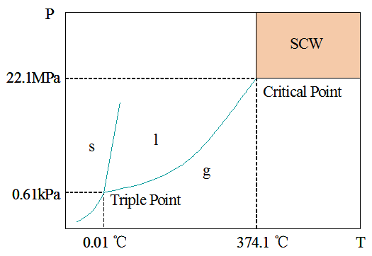 水的臨界點(diǎn)溫度是374.3℃,壓力22.05MPa,如果將水的溫度、壓力升高到臨界點(diǎn)以上,即為超臨界水(SCW)。