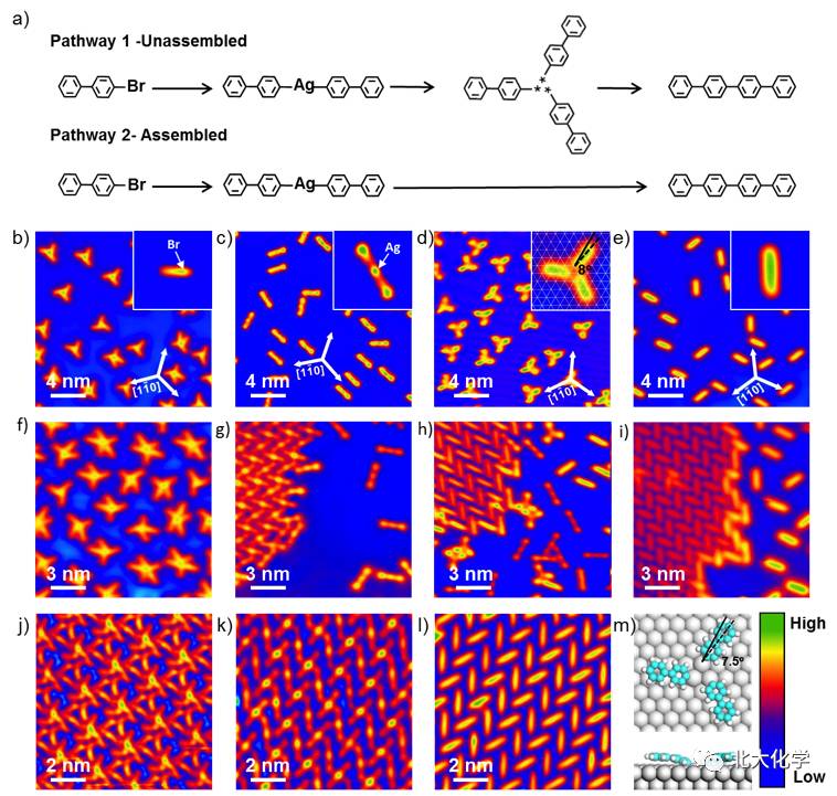 另外,該課題組又證實(shí)分子自組裝策略可以將金屬有機(jī)中間產(chǎn)物束縛在不同的反應(yīng)位點(diǎn)上:Ag(111)表面的三重孔位和二重橋位。這兩個(gè)位點(diǎn)表現(xiàn)出同一個(gè)反應(yīng)的明顯反應(yīng)活性差異。實(shí)驗(yàn)觀察到三重孔位吸附的中間物種優(yōu)先于二重橋位吸附的中間物種轉(zhuǎn)化為最終偶聯(lián)產(chǎn)物,降低反應(yīng)轉(zhuǎn)化溫度。這是首次直觀觀測(cè)到原子級(jí)平整的密堆積金屬表面三重孔位和二重橋位的反應(yīng)活性差異的案例。