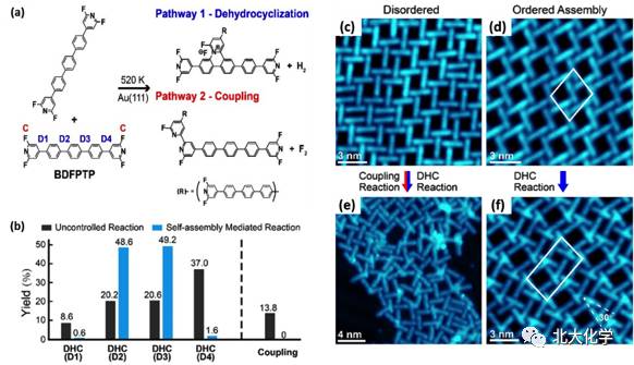 該課題組利用分子自組裝策略在Au(111)表面上實(shí)現(xiàn)了BDFPTP分子表面反應(yīng)的區(qū)域選擇性調(diào)控。研究發(fā)現(xiàn),當(dāng)分子在表面混亂排列時(shí),分子會(huì)發(fā)生兩個(gè)通道的反應(yīng),即脫氫環(huán)化反應(yīng)和脫氟偶聯(lián)反應(yīng);當(dāng)分子在反應(yīng)前先自組裝成有序結(jié)構(gòu)時(shí),只有脫氫環(huán)化的反應(yīng)通道被打開,脫氟偶聯(lián)反應(yīng)通道被完全切斷,反應(yīng)路徑的選擇性達(dá)到了100%,而產(chǎn)物分布也由原來的10種窄化為2種。這表明,反應(yīng)分子的表面自組裝導(dǎo)致了反應(yīng)產(chǎn)物分布的窄化和反應(yīng)選擇性的大幅提高。