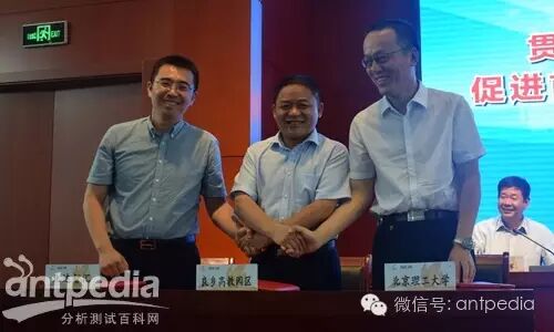 北京理工大學(xué)校長助理龍騰、房山高教園區(qū)管委會(huì)常務(wù)副主任蔡本睿、北京大學(xué)研發(fā)實(shí)驗(yàn)服務(wù)基地(房山)智匯城服務(wù)中心總經(jīng)理江向峰簽署《良鄉(xiāng)高教園區(qū)科技資源社會(huì)化開放共享三方合作協(xié)議書》。