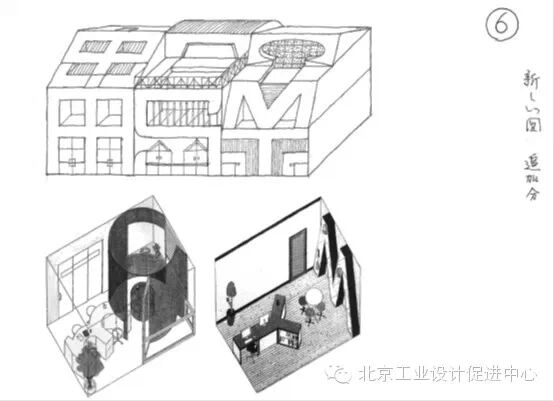 三維立體空間物全部的外觀構(gòu)思,從制圖上講, 就是在三面圖里,首先示意正面、立面,即按比例尺把實際長度縮小畫出實形,然后在一定的角度上平行地、畫出實長的縱深圖形。只需這樣繪圖,就能實現(xiàn)自由自在的設(shè)計。另外,居住空間內(nèi)部(interior) 的設(shè)計(圖6),就可以把實際形狀、實際尺寸用等比例畫出圖。這樣,就與斜軸測圖(Axonometric 圖法以20 世紀(jì)80年代時在意大利產(chǎn)生并影響全世界的“后現(xiàn)代設(shè)計”作為基本表現(xiàn)形式的繪圖法)一樣,成為讓人們在短時間內(nèi)獲得悟性、很好地認(rèn)識空間的表現(xiàn)手法,也是短時間內(nèi)能夠掌握的繪圖法。