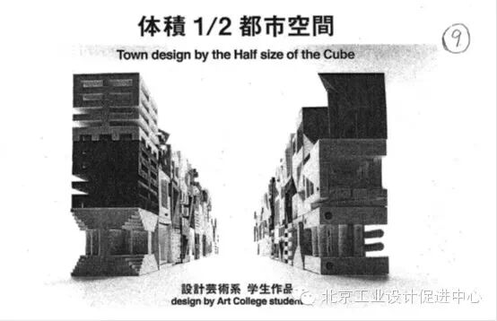 第三種是筆者開發(fā)出來的,矩形里面刻上90 度格子的線,折90 度,沒有面與面的接合,只有線與線、線與面的接合。可以說是數(shù)碼、模擬復(fù)合能力培養(yǎng)的技法,更是一種針對未來“平面(panel) 文明社會” 原理的發(fā)明想象。(圖7、圖8)(四)“1/2 體積的空間設(shè)計”(圖9)。仍保留立方體的整體概念,但去掉其內(nèi)部體積(容積)的一半,滿足現(xiàn)實都市生活的條件進(jìn)行設(shè)計,進(jìn)而把它們組合起來,就會出現(xiàn)一種超越“后現(xiàn)代設(shè)計” 的全新都市景觀。