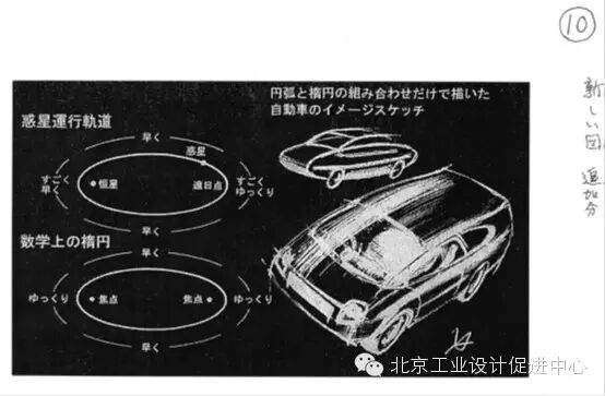 由此突然聯(lián)想到與宇宙中天體運動的類比。宇宙內(nèi)99% 以上的星際物質(zhì)是在橢圓的軌道上運行的,行星繞著恒星在橢圓軌道上運動的情形,是到近日點速度快(越近近日點速度越快),遠(yuǎn)日點速度慢(越近遠(yuǎn)日點速度越慢),這是宇宙里最大的運動原理。把這個應(yīng)用到畫幾何學(xué)里有兩個焦點的橢圓圖形上,近焦點的地方,畫得快一些,焦點間的曲線則慢慢描, 這樣就能畫出漂亮的橢圓形了。筆者注意到,當(dāng)準(zhǔn)備漂亮地畫出橢圓的時候,手就不會像畫正圓那樣勻速運動,而是本能地快慢組合,畫出橢圓。也就是說,人類的手,其自然力中就內(nèi)藏了一半的天體運動性(規(guī)律)。因此,這種畫圖技法只要稍加練習(xí),就猶如宇宙本能一下子蘇醒了一樣,能超越設(shè)計師,流暢地把圖畫出來了。如果使用這種畫圖術(shù),任何人都能成為大部分曲面型工業(yè)產(chǎn)品的設(shè)計師。(圖10)